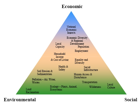 Scope of usage of Sustainability Beside socio-semantical trap-doors, the scope of the concept of Sustainability also differs widely. Biocentric and anthropocentric approaches clash, and the famous sustainability triangle has been further developed. From the triangle